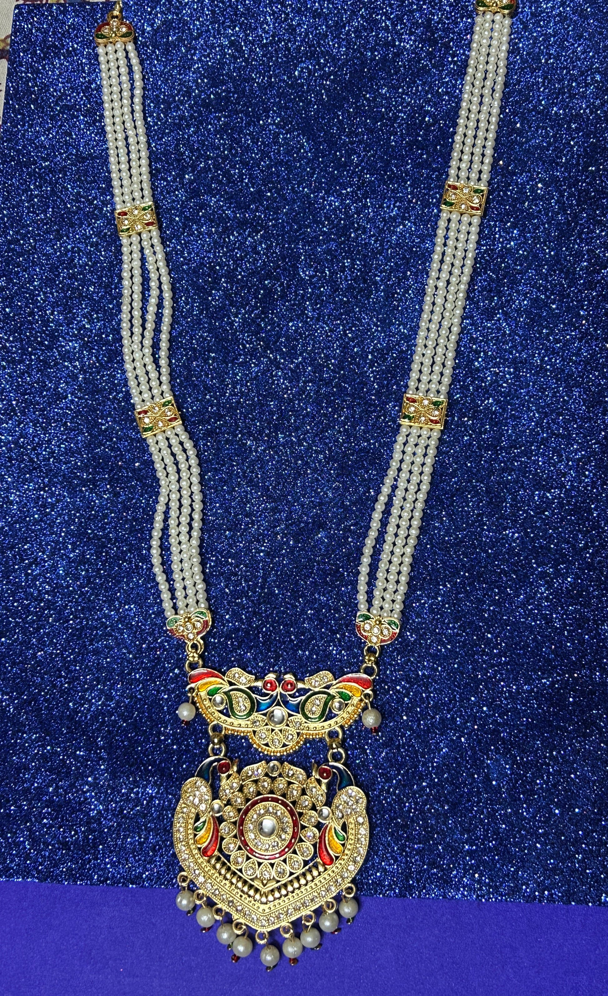 Royal Kundan Pearl Long Necklace Elevate your ethnic ensemble with this exquisite long necklace, masterfully combining traditional kundan craftsmanship with lustrous pearls. The intricate kundan setting showcases premium gemstones arranged in ornate patterns, while graceful pearls add refined elegance and luminosity. This versatile piece transitions seamlessly from festive occasions to special celebrations, complementing both sarees and traditional attire. The extended length offers contemporary styling flexibility while honoring classical jewelry design. Crafted for those who appreciate authentic artisanal work and timeless sophistication, this necklace serves as a statement accessory that captures the essence of Indian luxury jewelry heritage.